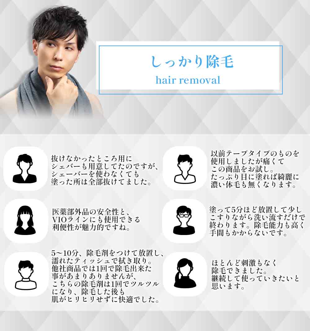 - 脱毛エステ仕様!1本で全身のムダ毛をスッキリ除毛できる薬用除毛クリーム。